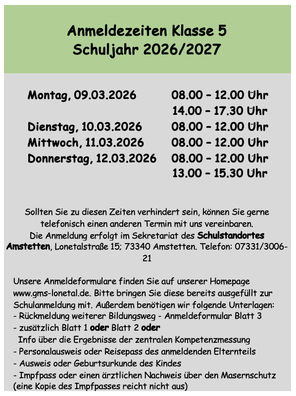 Anmeldezeiten Fünftklässler Schuljahr 2026/2027
